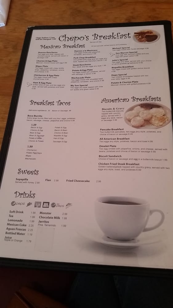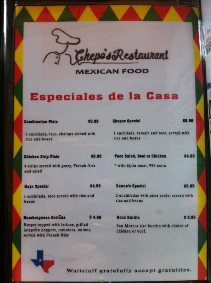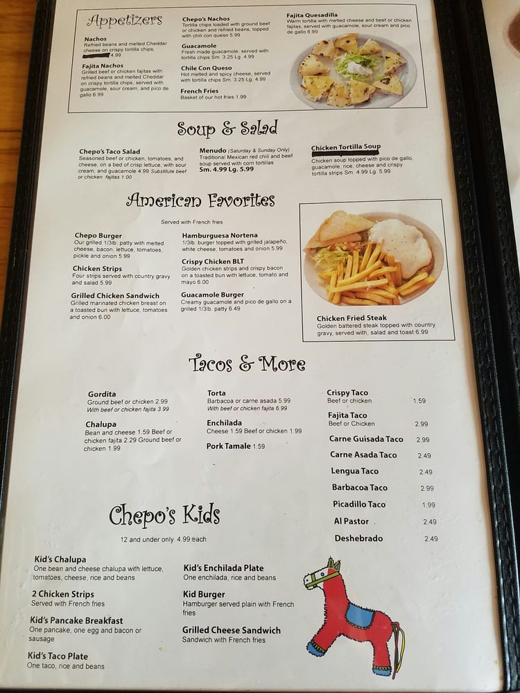 Welcome to Chepo's Mexican Restaurant, a vibrant eatery nestled in San Marcos, TX. This charming spot offers an array of delicious Mexican fare in a casual setting, perfect for families, groups, and those on the go. With a menu featuring delightful appetizers like Fajita Nachos and hearty mainstays such as the Chepo Burger, there's something for everyone.
